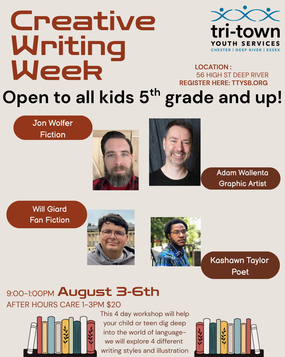 Writers Workshop August 3 @ 9:00 AM - August 6 @ 1:00 PM Tri-Town Youth Services 56 High St., Deep River, CT, United States